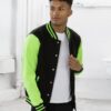 Soft cotton faced fabric. Taped neck with hanging loop. Knitted collar, cuffs and hem with stripe detail. Contrast electric coloured sleeves. Press stud closure with contrast electric coloured studs. Two contrast welt pockets. Small opening in pocket for ear phone cord feed. Hidden ear phone loops. Tear out label. WRAP Certified Production.