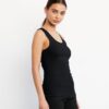 Fitted style. Self fabric bound neckline and armholes. Twin needle hem.