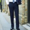 Tailored fit. Flat front. Belt loops. Zip fly with button over. Key loop. Two side pockets. Rear pocket. Machine washable.