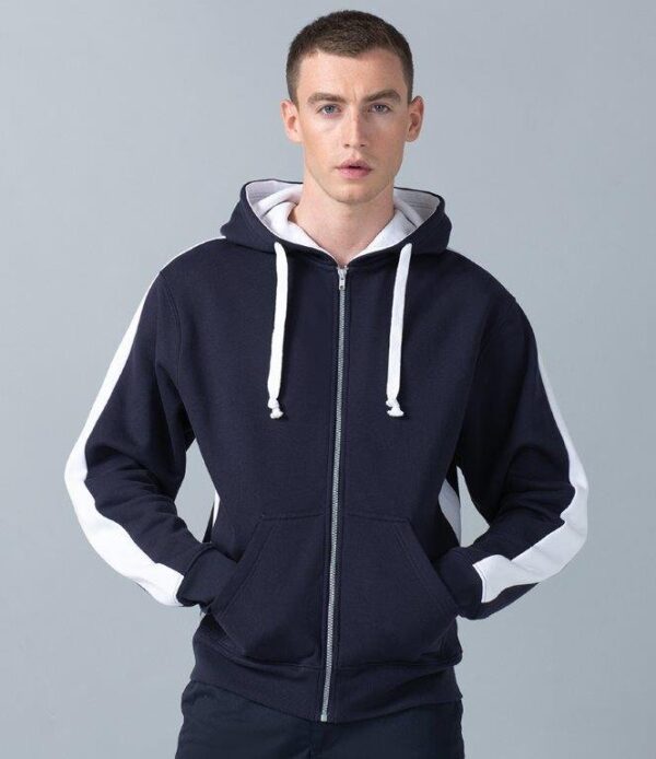 Contrast lined hood and drawcord. Full length zip. Contrast panels on shoulders, sleeves and sides. Front pouch pockets. Ribbed cuffs and hem.