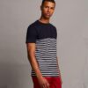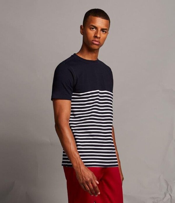 Single jersey. Ribbed stretch collar. Flatlock stitched V detail at front neckline. Flatlock stitched neckline, shoulders and armholes. Contrast taped neck. High chest seam. Contrast striped lower body. Side seams. Twin needle sleeves and hem. Tag free.