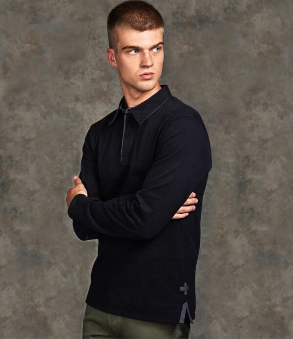 Heavily brushed for a luxurious feel. Two piece shirt style collar. Single jersey self fabric top collar. Tonal canvas collar stand and under collar. Flat tape detail inside neck. Two button concealed placket with contrast canvas inner placket and box stitch detail. Twin needle hexagonal locker patch. Contrast tape detail on left side seam. Contrast external flat taped side vents. Tonal canvas detail on inside of hem. Small hem loop label. Ribbed cuffs. Stepped hem. Printed back neck. For leisure use only.