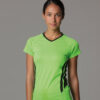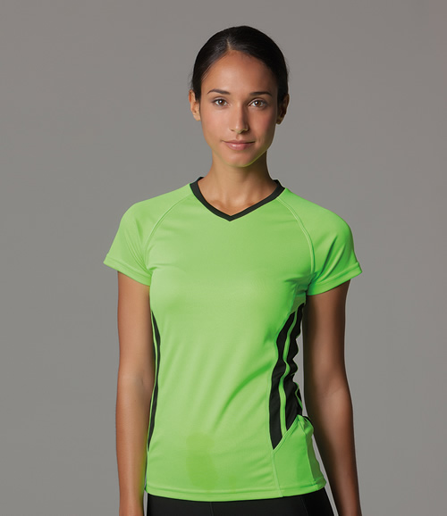 Fitted style. Moisture management fabric allows you to stay cool, dry and comfortable. Printed neck label. Contrast self fabric V neck. Raglan sleeves. Contrast bound side panels. Twin needle sleeves and hem.