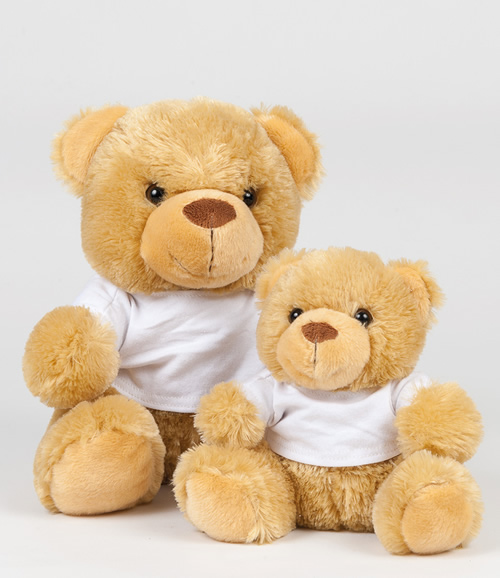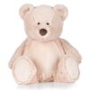 Mid brown coloured soft plush bear. Sewn eyes. Contrast brown nose. Light brown coloured panel on tummy and feet. Removable inner stuffing. Zip access for decoration onto front panel. Suitable for embroidery, print and sublimation.