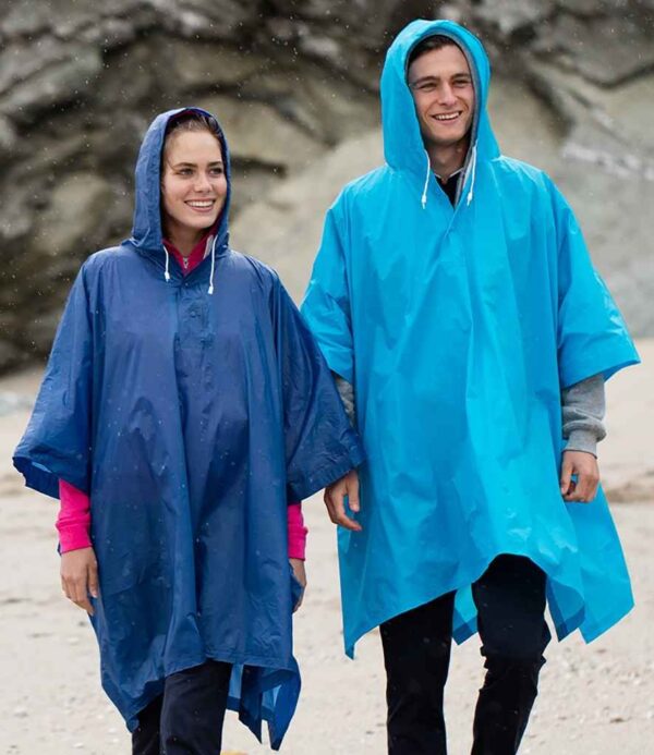 Popper neck fastenings. Drawstring hood. Can be opened up and laid flat to be doubled as a groundsheet. Comes in a press fastened carry case with a drawstring handle. Carry case branded on one side - other side free for decoration.
