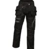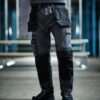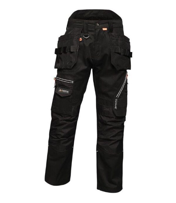 Slim fit. High shaped back waistband with belt loops and D ring attachments. Inner anti-slip waistband. Zip fly with button and shank button over. Foldaway holster pockets with multiple compartments. Two side pockets. One right hip zip pocket. Reinforced crotch seam. Two multi-function tool and mobile phone pockets on legs with reflective piping. Elasticated panels above knees for ease of movement. Cordura top loading knee pad pockets. Drawcord hem with reinforced hem overlay. Triple needle stitching. Reflective piping on rear of legs. Branding on left waistband, rear belt loop, rear and lower leg pockets.